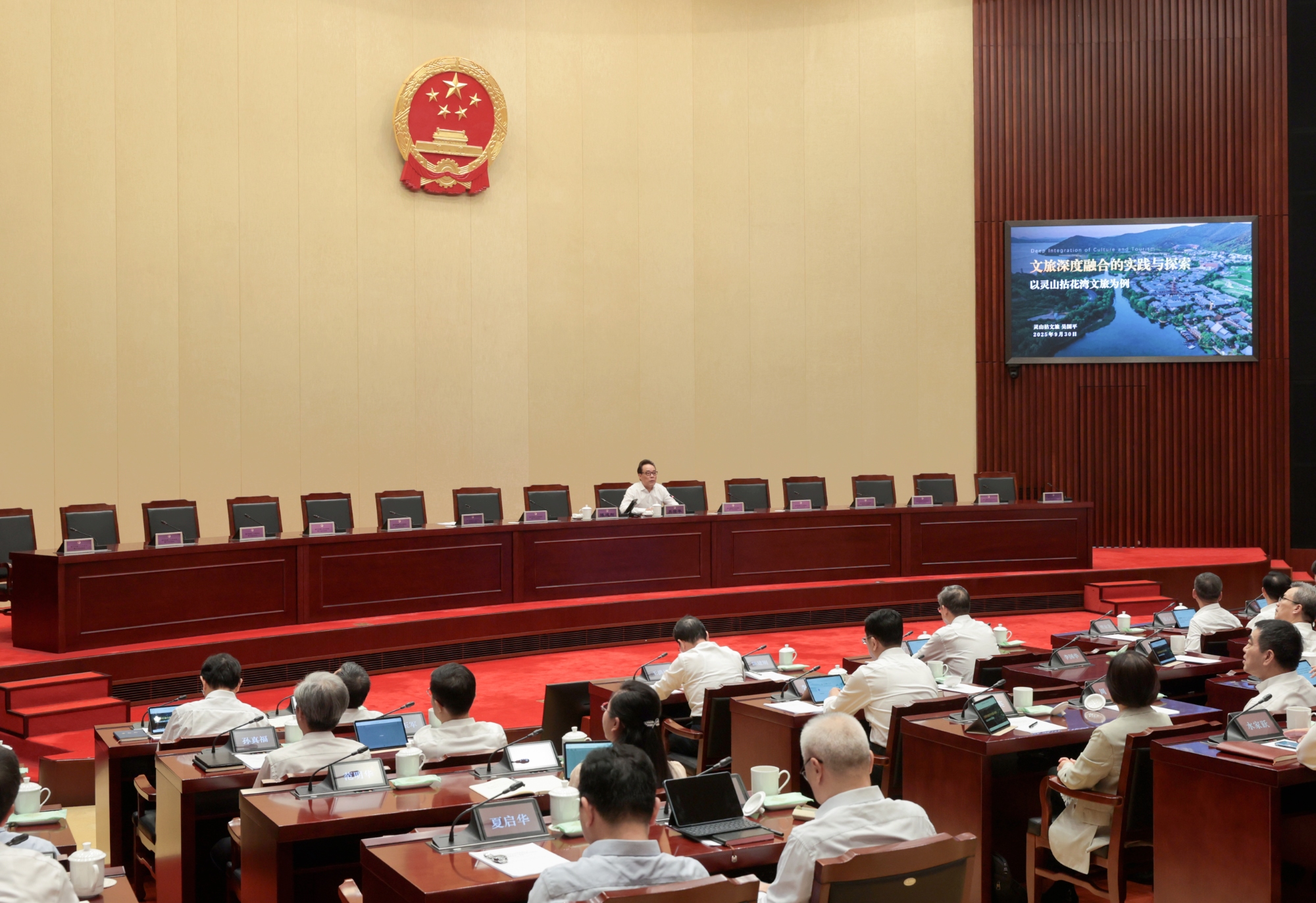 9月30日上午,省十四屆人大常委會第十七次會議舉辦專題講座,省人大常委會秘書長陳建剛主持。省體育局局長陳少軍與全國人大代表、無錫拈花灣文化投資發展有限公司董事長吳國平,圍繞“文體旅融合發展”主題分別作專題報告。